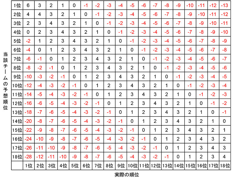 以前の記事に書いたとおり、S研方式では、1位から18位までをすべて的中させたら、100点満点とする。ただし、優勝、ACL圏、降格チームを予想することは、中位の順位よりもずっと重要である。そこで、S研方式では、1位には12点、2~3位には8点、4~15位には4点、16~18位には8点を割り当てて、計100点とする。その際に、S研方式では、予想した順位が完全に一致しなくても、予想の惜しさに応じて得点を与える。たとえば、10位のチームを的中させたら4点だが、そのチームを9位または11位と予想しても3点が、8位または12位と予想しても2点が、7位または13位と予想しても1点がもらえる。それで、S研方式の恐ろしいところは、予想の外れ幅が大きいと、その外れ具合に応じて、マイナス点が与えられることである。この方式が素晴らしいのは、そうすることによって、上位や下位の予想を大きく外すと、大幅なマイナスに陥ることである。パーフェクトならプラス100点だが、下手な予想をすると、最悪でマイナス200点とかになることもありうる。