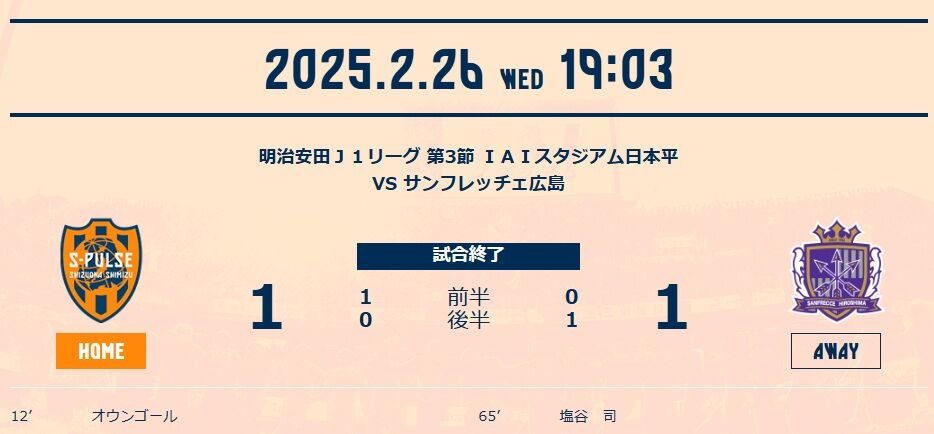 後半にも清水には何度かチャンスもあったが、寒空の中で押され気味の試合を観ていたオレンジサポの多くは、「このまま勝ち点1で終わってくれ」という思いだったのではないか。最初から広島がフルスロットルで来たら、飲み込まれていたと思われ、つくづく今季ここまでの清水はツイてるなと感じる。