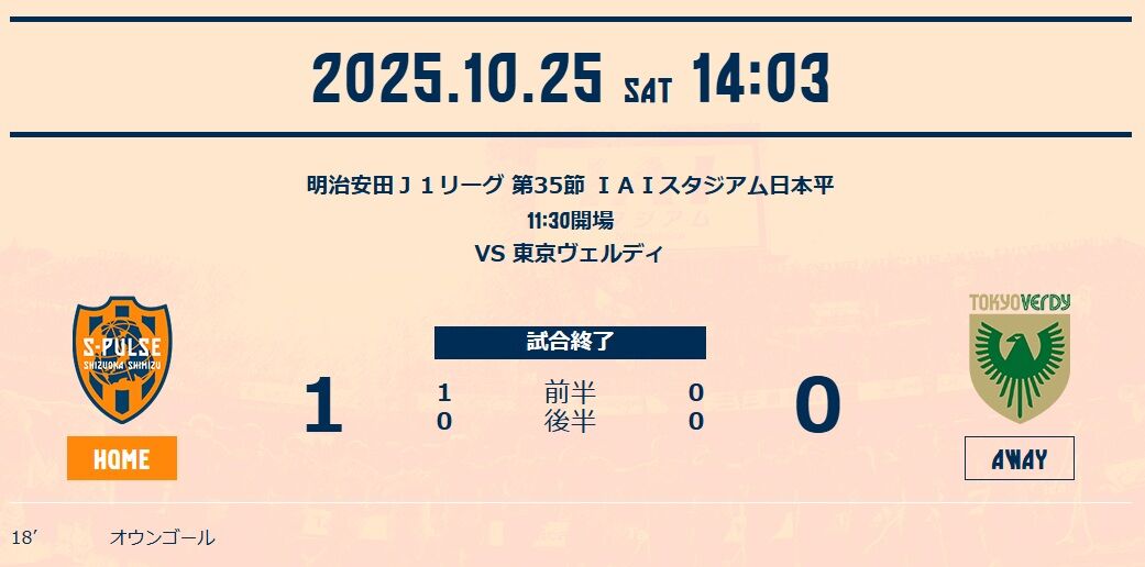 晴れて残留が決まったわけだけど、このヴェルディ戦を見せられると、達成感は乏しい。清水が試合を通して放ったシュートはわずか4本で、後半は乾がドリブルで持ち込んで打った1本だけ。少ないチャンスを良く活かして勝ったと言えなくもないが、決して強敵とは言えない相手に、低調な戦いに終始した。